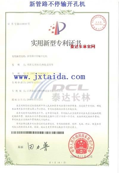 新管路不停输开孔机-实用专利证书