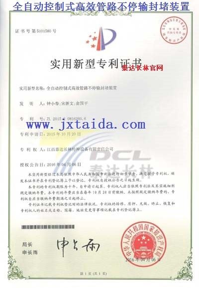 全自动控制室高效管路不停输封堵装置-实用型专利证书