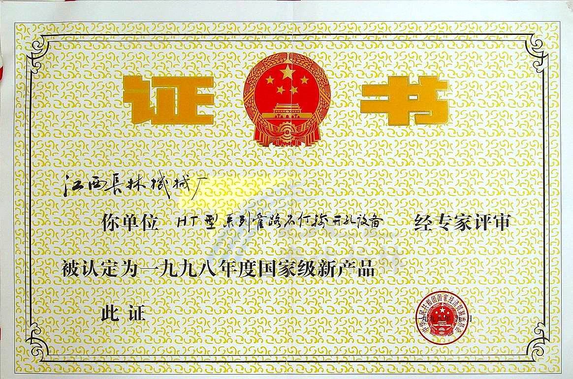1998年HT型系列管路不停输开孔设备评为国家级新产品